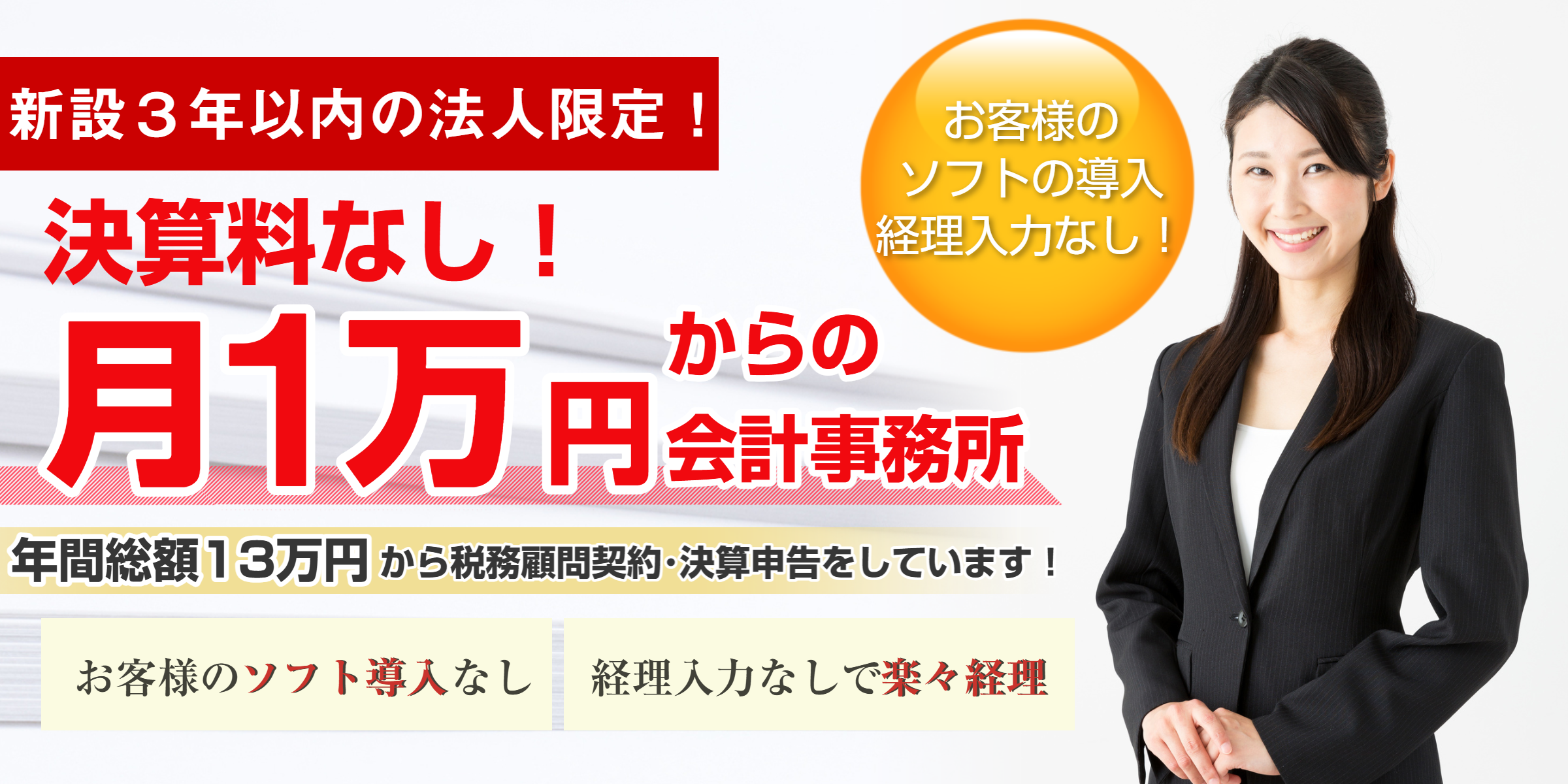 (消費税別・上記の金額には通帳1冊、領収書250枚までの入力(記帳代行)が含まれています。この値段での契約を保障するものではありません。法人の内容・決算月によってはこの契約ができない場合もあります。別途必要な料金として、消費税申告料金(原則・簡易課税5万円)、給料の支給がある場合の年末調整料金(5人まで顧問料1.5ヶ月分)があります。)
